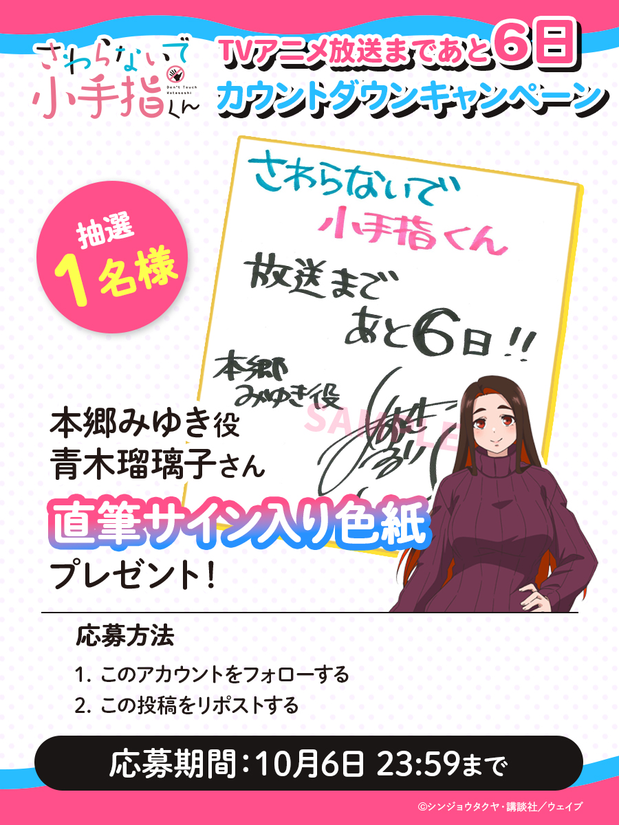 『さわらないで小手指くん』TVアニメ公式X(@kotesashi_anime)をフォロー・該当のポストをリポストしていただいた方の中から抽選で1名様に「本郷みゆき役 青木瑠璃子さん直筆サイン入り色紙」をプレゼント!