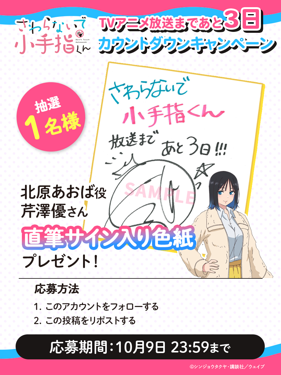 『さわらないで小手指くん』TVアニメ公式X(@kotesashi_anime)をフォロー・該当のポストをリポストしていただいた方の中から抽選で1名様に「北原あおば役 芹澤優さん直筆サイン入り色紙」をプレゼント!