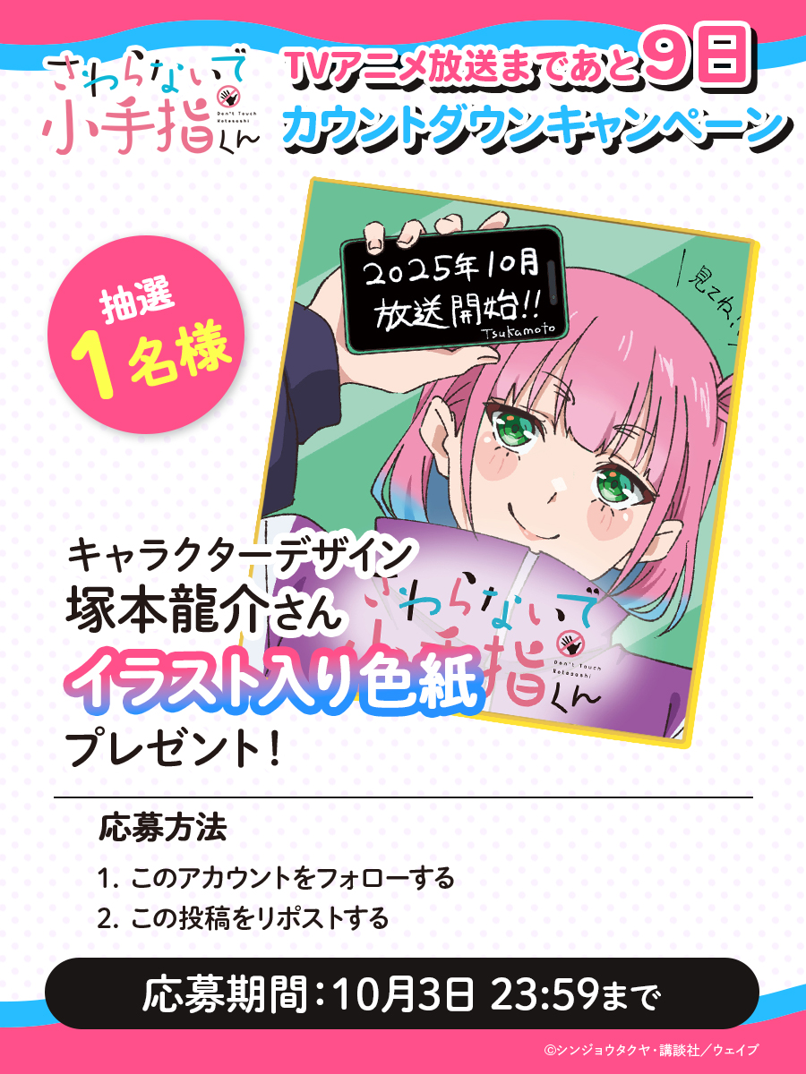 『さわらないで小手指くん』TVアニメ公式X(@kotesashi_anime)をフォロー・該当のポストをリポストしていただいた方の中から抽選で1名様に「キャラクターデザイン 塚本龍介さんイラスト入り色紙」をプレゼント!