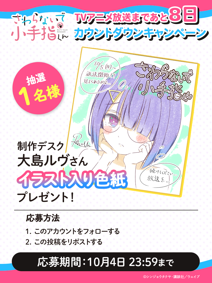 『さわらないで小手指くん』TVアニメ公式X(@kotesashi_anime)をフォロー・該当のポストをリポストしていただいた方の中から抽選で1名様に「制作デスク 大島ルヴさんイラスト入り色紙」をプレゼント!